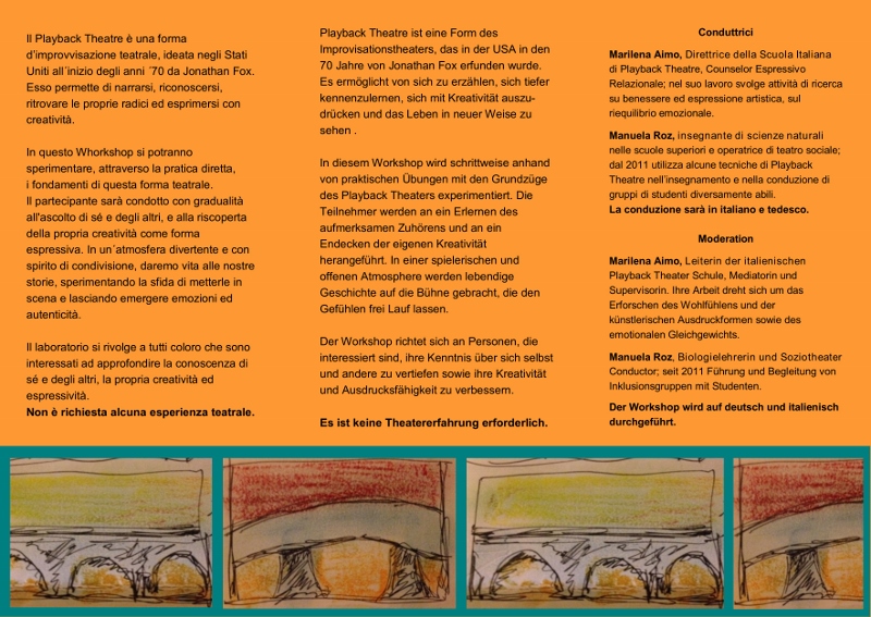 Playback Theatre ist eine Form des Improvisationstheaters, der lebendige Geschichte, Erzählungen und Erfahrungen auf die Bühne bringt und den Gefühlen frei Lauf lässt. In einer spielerischen und offenen Atmosphere werden die Teilnehmer an ein Erlernen des aufmerksamen Zuhörens und an ein Endecken der eigenen Kreativität herangeführt.